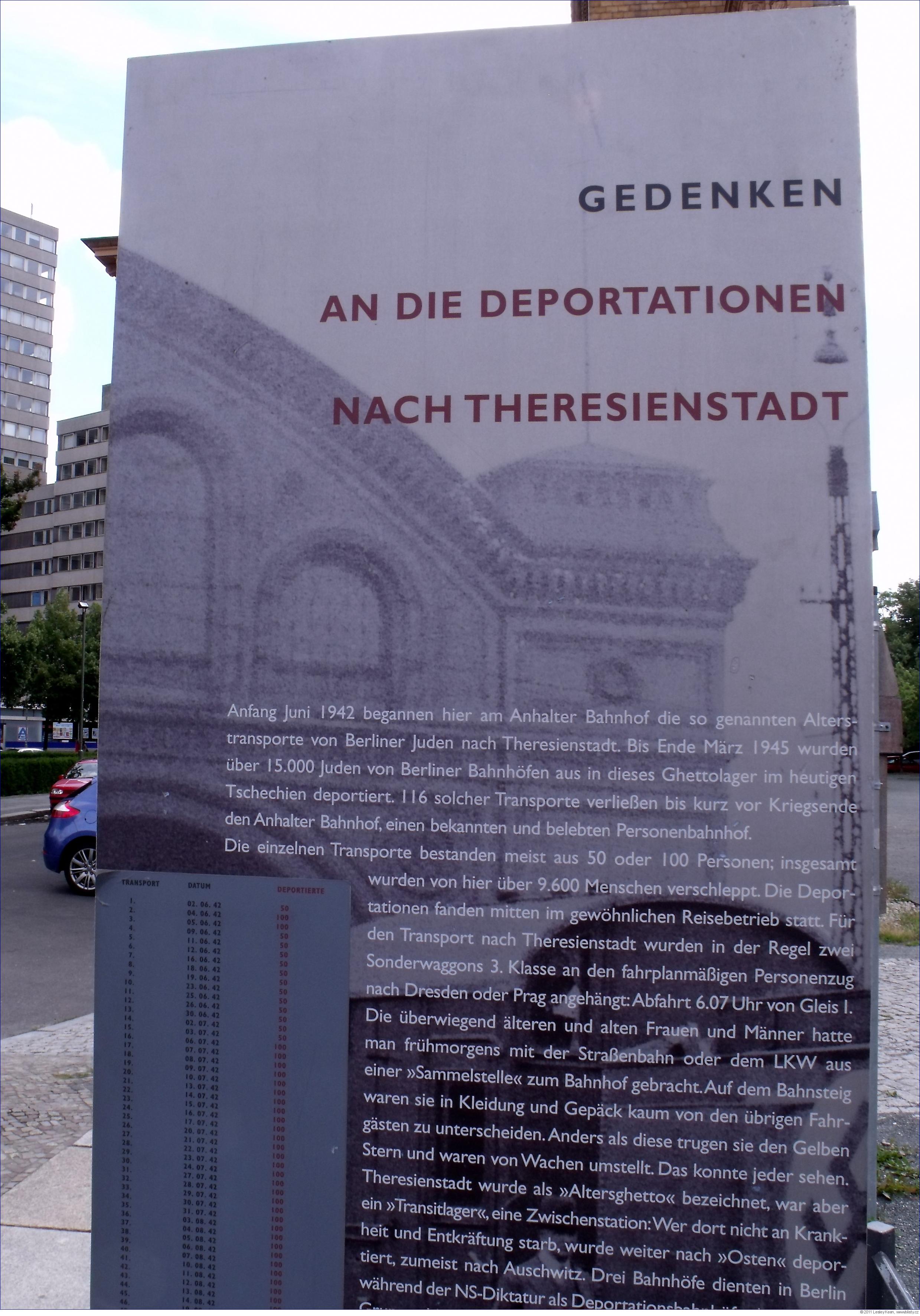 Bydlel jsem v hotelu nedaleko někdejšího nádraží, nyní stanice S-bahn Anhalter Bahnhof. Z vybombardovaného nádraží zůstává jen troska průčelí, před nímž je pomníček, na němž je - zase s německou precizností - uvedeno, že z toho nádraží byli deportování do Terezína od začátku 40. let němečtí židé. Je přesně napsáno, kdy vlaky odjížděly a který vlak odvezl kolik deportovaných. Děsiví duchové minulosti jsou v dnešním, dynamicky se rozvíjejícím Berlíně, přítomni všude.