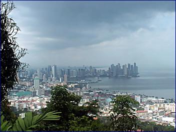Pohled z kopce Ancor na moderní centrum hlavního města Panamá. Před rokem 2000 část základny USA.