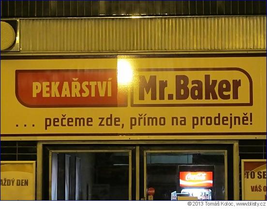 Můj dnešní Koutek reklamní tuposti částečně souvisí s tím včerejším, který pojednával o názvu piva, o němž pohostinský podnik inzeroval, že je lze ochutnat "NA pivnici". Průmyslový básník (dnes se mu říká copywriter) pekařství Mr. Baker (= českého! řetězce s anglickým názvem, který má v ČR více než třicet poboček s mnou vyfoceným štítem), stejně jako majitel dané restaurace, ve škole nejspíš  chyběl, když se probíraly předložky vážící se k 6. pádu. Jinak by věděl, že k dějům odehrávajícím se uvnitř těchto provozoven se v českém spisovném jazyce váže přeložka "v" a že pokud se něco "peče přímo NA prodejně", může se to z hlediska gramatického péct leda na její střeše.