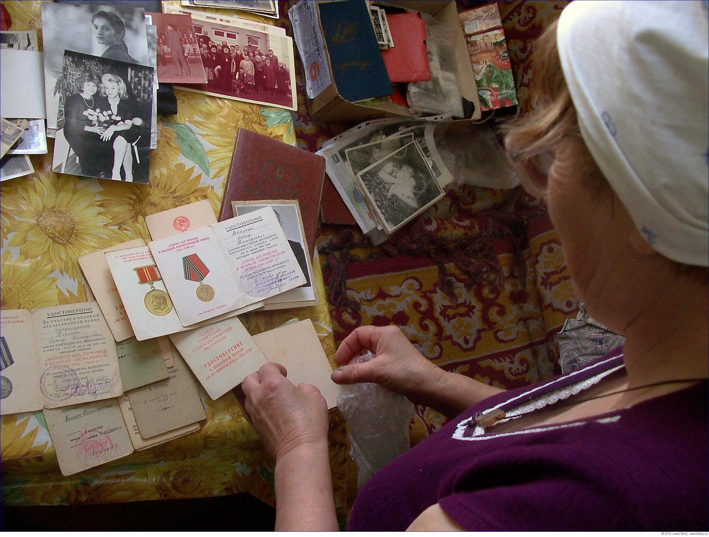 Když jsem na Krošnu dorazil, zjistil jsem, že Míla celou věc vyřešila způsobem, který mne velmi zaskočil. Objednala mi bydlení u kamarádky Galy, kterou jsem ovšem ještě nikdy neviděl. Měl jsem dávat minule více pozor. Ale pohltily mne vzápětí její fotografie, jež rozkládá na stole: její manžel Josif Timofejeviš Denisjuk byl hrdina 2. světové války, má po něm tolik legitimací a medailí, že je nestačí naskládat na stůl.