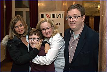 Emma je celá zaražená, chce odejít, když to celé extempore končí. Chytám ji u vchodu a způsobuji několik rodinných fotografií ještě s chotěm Peterem. „Je tady Emička?“ povykuje Monika (to nevěděla, že přijde?), která odbíhá od zástupu fanoušků ve frontě u stolu, co od ní chtějí mermomocí ještě podpis. Bude to prostě jen několik snímků na památku (do rodinného památníku). Všímám si, že Emma má zlaté vysoké (martensky?). „Vypadaj dobře!“ říkám. Zablýsklo jí v očích: „Někdo má boty, někdo zas provokativní otázky!“ To nám ta Emička ale vyrostla, že?