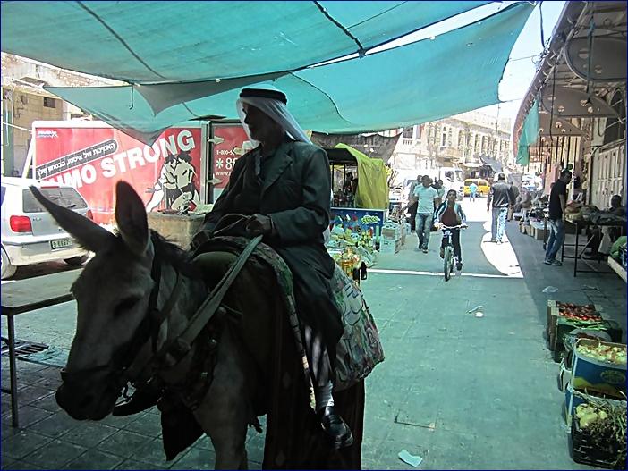 Oslík ve starém městě v Hebronu. Jen několik desítek metrů jeho směrem jsou nad tržištěm budovy ilegálních osadníků: